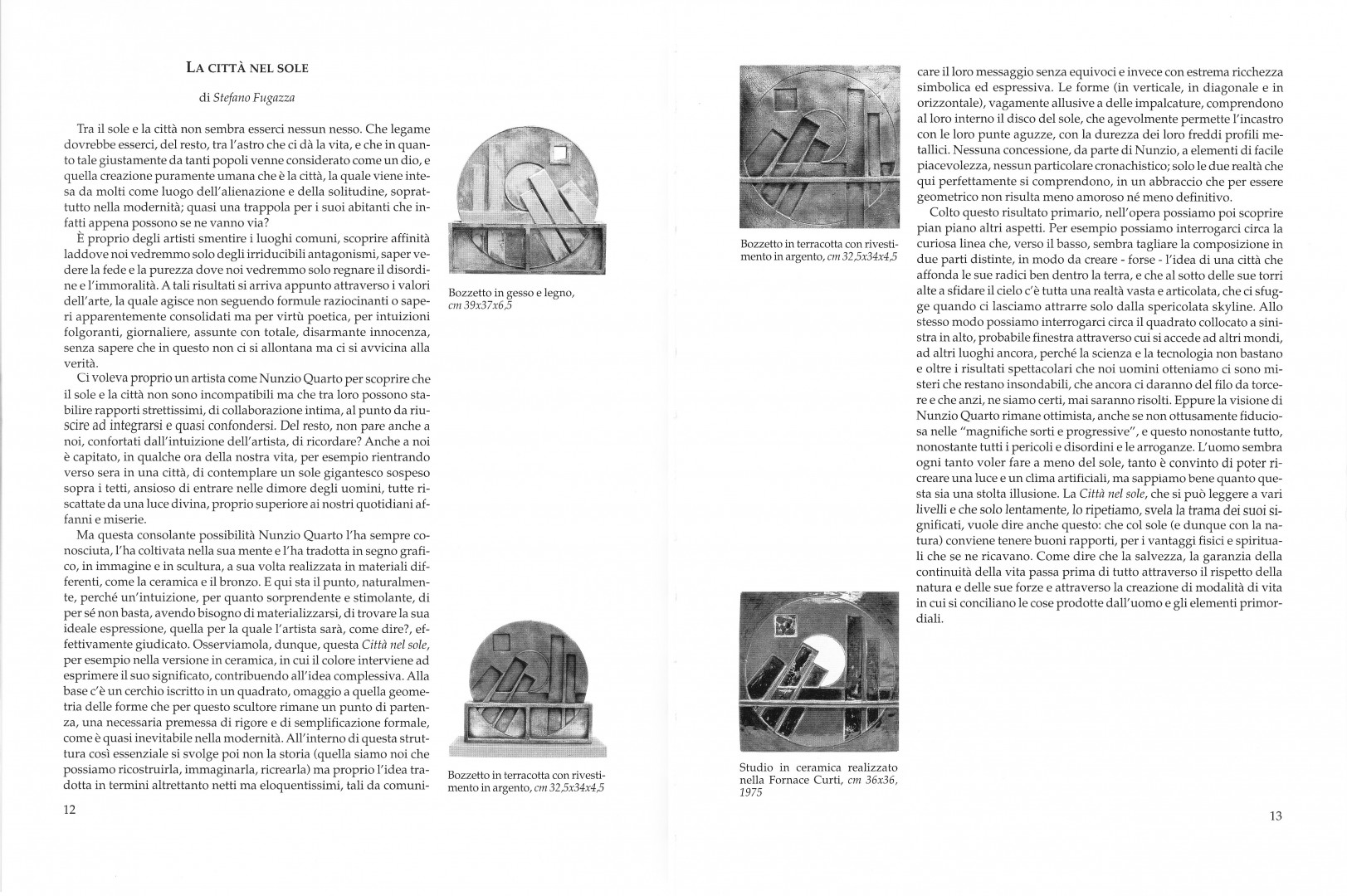 Ma questa consolante possibilità Nunzio Quarto l’ha sempre conosciuta, l’ha coltivata nella sua rnente e l’ha tradotta in segno grafico, in immagine e in scultura, a sua volta realizzata in materiali differenti, come la ceramica e il bronzo. E qui sta il punto, naturalmente, perché un’intuizione, per quanto sorprendente e stimolante, di per sé non basta, avendo bisogno di materializzarsi, di trovare la sua ideale espressione, quella per la quale l’artista sarà, come dire?, effettivamente giudicato. Osserviamola, dunque, questa Città nel Sole, per esernpio nella versione in ceramica, in cui il colore interviene ad esprimere il suo significato, contribuendo all’idea complessiva. Alla base c’è un cerchio iscritto in un quadrato, omaggio a quella geometria delle forme che per questo scultore rimane un punto di partenza, una necessaria premessa di rigore e di semplificazione formale, come e quasi inevitabile nella modernità. All’interno di questa struttura cosi essenziale si svolge poi non la storia (quella siarno noi che possiamo ricostruirla, immaginarla, ricrearla) ma proprio l’idea tradotta in termini altrettanto netti rna eloquentissimi, tali da comunicare il loro messaggio senza equivoci e invece con estrema ricchezza simbolica ed espressiva. Le forme (in verticale, in diagonale e in orizzontale), vagamente allusive a delle impalcature, comprendono al loro interno il disco del sole, che agevolmente permette l’incastro con le loro punte aguzze, con la durezza dei loro freddi profili metallici. Nessuna concessione, da parte di Nunzio, a elementi di facile piacevolezza, nessun particolare cronachistico; solo le due realtà che qui perfettamente si comprendono, in un abbraccio che per essere geometrico non risulta meno amoroso né meno definitivo.
