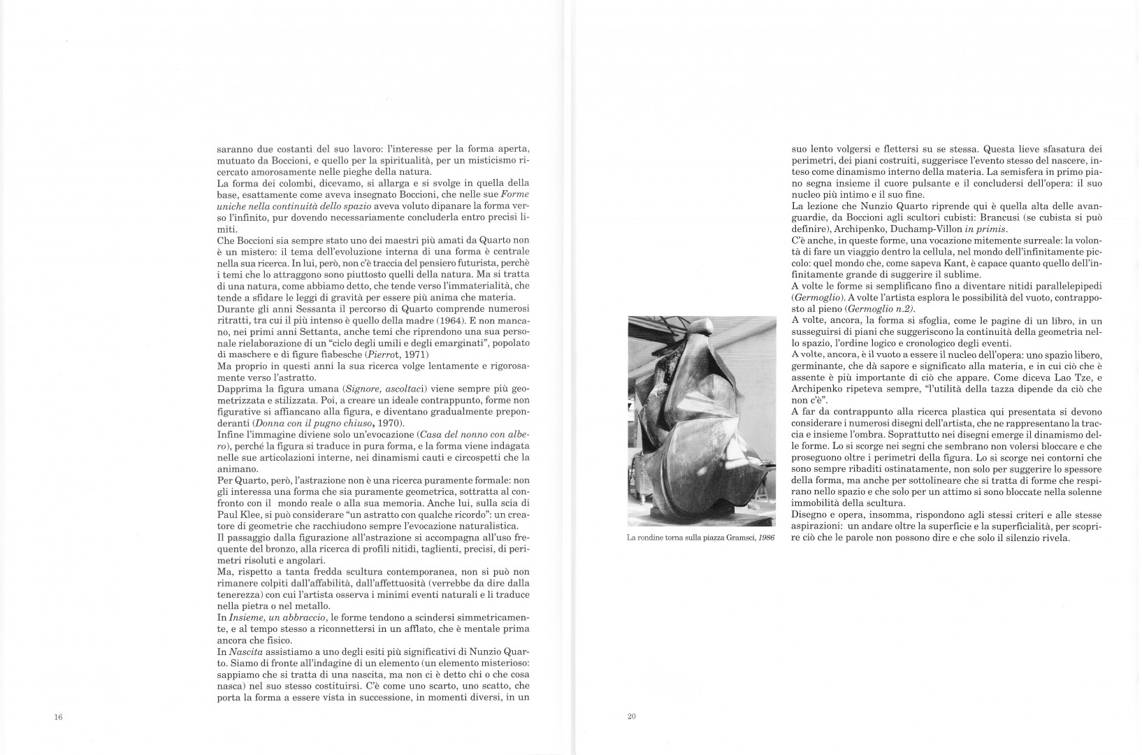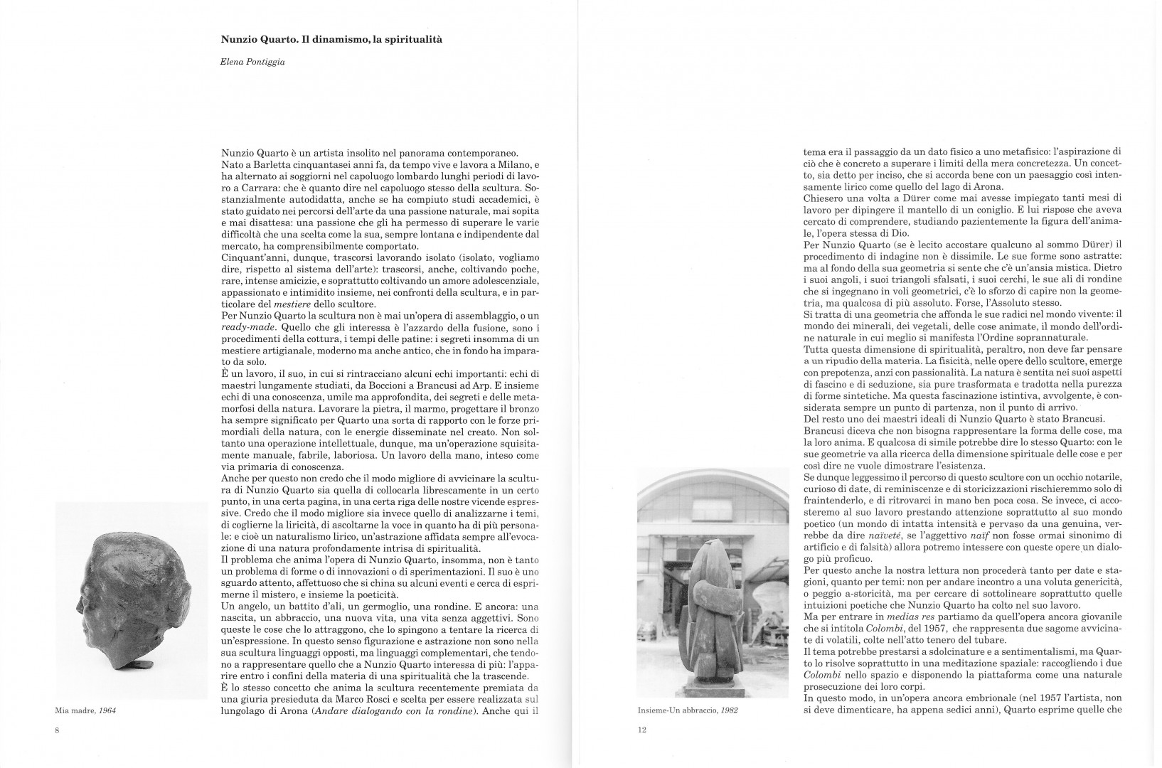 Nunzio Quarto è un artista insolito nel panorama contemporaneo. Nato a Barletta cinquantasei anni fa, da tempo vive e lavora a Milano, e ha alternato ai soggiorni nel capoluogo lombardo lunghi periodi di lavoro a Carrara: che è quanto dire nel capoluogo stesso della scultura. Sostanzialmente autodidatta, anche se ha compiuto studi accademici, è stato guidato nei percorsi dell’arte da una passione naturale, mai sopita e mai disattesa: una passione che gli ha permesso di superare le varie difficoltà che una scelta come la sua, sempre lontana e indipendente dal mercato, ha comprensibilmente comportato. Cinquant'anni, dunque, trascorsi lavorando isolato (isolato, vogliamo dire, rispetto al sistema dell’arte): trascorsi, anche, coltivando poche, rare, intense amicizie, e soprattutto coltivando un amore adolescenziale, appassionato e intimidito insieme, nei confronti della scultura, e in particolare del mestiere dello scultore. Per Nunzio Quarto la scultura non è mai un’opera di assemblaggio, o un ready-made. Quello che gli interessa è l’azzardo della fusione, sono i procedimenti della cottura, i tempi delle patine: i segreti insomma di un mestiere artigianale, moderno ma anche antico, che in fondo ha imparato da solo. È un lavoro, il suo, in cui si rintracciano alcuni echi importanti: echi di maestri lungamente studiati, da Boccioni a Brancusi ad Arp. E insieme echi di una conoscenza, umile ma approfondita, dei segreti e delle metamorfosi della natura. Lavorare la pietra, il marmo, progettare il bronzo ha sempre significato per Quarto una sorta di rapporto con le forze primordiali della natura, con le energie disseminate nel creato. Non soltanto una operazione intellettuale, dunque, ma un’operazione squisitamente manuale, fabrile, laboriosa. Un lavoro della mano, inteso come via primaria di conoscenza. Anche per questo non credo che il modo migliore di avvicinare la scultura di Nunzio Quarto sia quella di collocarla librescamente in un certo punto, in una certa pagina, in una certa riga delle nostre vicende espressive. Credo che il modo migliore sia invece quello di analizzarne i temi, di coglierne la liricità, di ascoltarne la voce in quanto ha di più personale: e cioè un naturalismo lirico, un’astrazione affidata sempre all’evocazione di una natura profondamente intrisa di spiritualità. Il problema che anima l’opera di Nunzio Quarto, insomma, non è tanto un problema di forme o di innovazioni o di sperimentazioni. Il suo è uno sguardo attento, affettuoso che si china su alcuni eventi e cerca di esprimerne il mistero, e insieme la poeticità. Un angelo, un battito d’ali, un germoglio, una rondine. E ancora: una nascita, un abbraccio, una nuova vita, una vita senza aggettivi. Sono queste le cose che lo attraggono, che lo spingono a tentare la ricerca di un’espressione. In questo senso figurazione e astrazione non sono nella sua scultura linguaggi opposti, ma linguaggi complementari, che tendono a rappresentare quello che a Nunzio Quarto interessa di più: l’apparire entro i confini della materia di una spiritualità che la trascende.