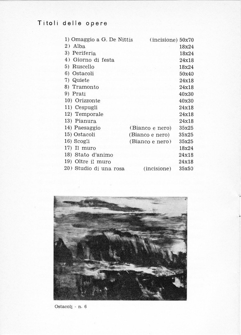 Le venti creature sono sintetizzabili in una sola opera: la ricchezza interiore dell'artista tendente a superare gli SCOGLI, gli OSTACOLI, i CESPUGLI nella ricerca dell'espressione di quel contenuto di vita direzionalmente rivolto verso la luce.... il TEMPORALE, il RUSCELLO, i PRATI, l'ALBA, il TRAMONTO sono tutti "stati d'animo" che implicano il MURO e la tendenza ad andare OLTRE IL MURO...